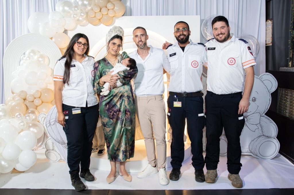 שמונה ימים לאחר מכן, צוות מד”א שהוזמן על ידי יניב ויסמין הגיע לאירוע ברית המילה של התינוק הקטן שם נחשף שמו – ניתאי. “אחרי כל הניסיונות האלה שעברנו, אנחנו זוכים לקיים ברית מילה בשמחה והודיה גדולה על כל הניסים והאתגרים שעברנו בדרך אליו ומאחלים לו שיהפוך חולשה לעוצמה גדולה, ויהיה ילד עם עוצמות וחוזקות מיוחדות”, נאם יניב מול הקהל והוסיף, “אני רוצה להגיד תודה לאורחים מיוחדים שנמצאים פה איתנו, לפראמדיקים במד”א היקרים אדל, ירין ודביר שהיו השליחים הכי טובים, מקצועיים ומדויקים בסיטואציה שנקלענו אליה. מי שלא יודע יסמין ילדה בבית על הרצפה בסלון והאמת שהרגשנו כאילו שיש איתנו צוות שלם של מילדות עם 20 שנות ניסיון, הכל נעשה ברוגע, בנחת ובדאגה. תמשיכו להציל חיים ולעזור בהבאת חיים לעולם. תמיד אומרים לזוגות – ‘שתצאו בידיים מלאות’, אז במקרה הזה שלנו, נכנסו לבית חולים בידיים מלאות ויצאנו בידיים מלאות”.